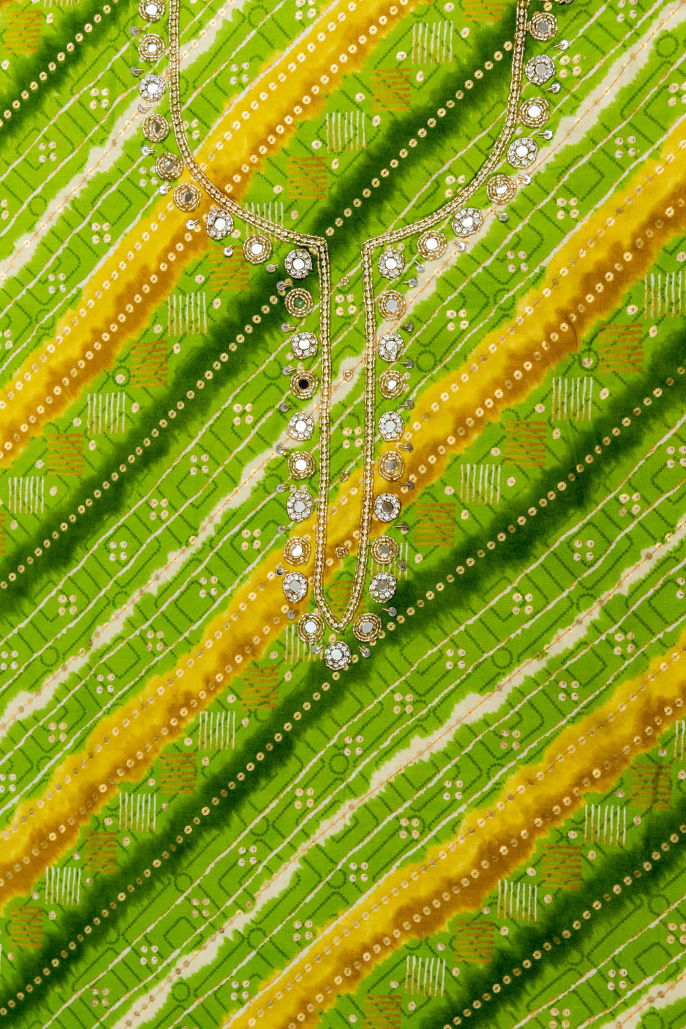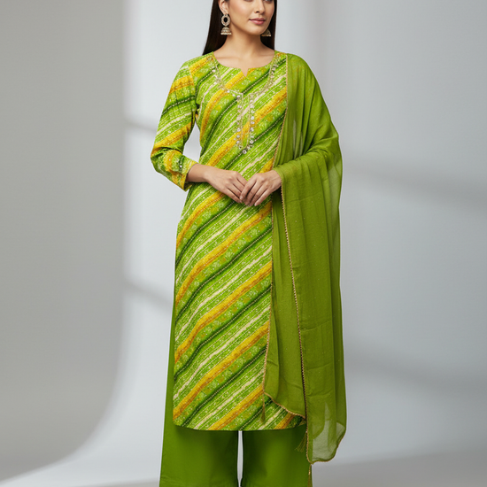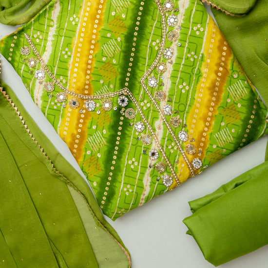 The suit features traditional Bandhani and Lehriya prints, celebrating the rich artistry of Rajasthan and Gujarat with vibrant hues and intricate tie-dye patterns. The beauty of the outfit is enhanced with delicate Cutdana work, Mirror work, Sequence work, and Zarkan embellishments, adding a touch of sparkle and sophistication to your look.