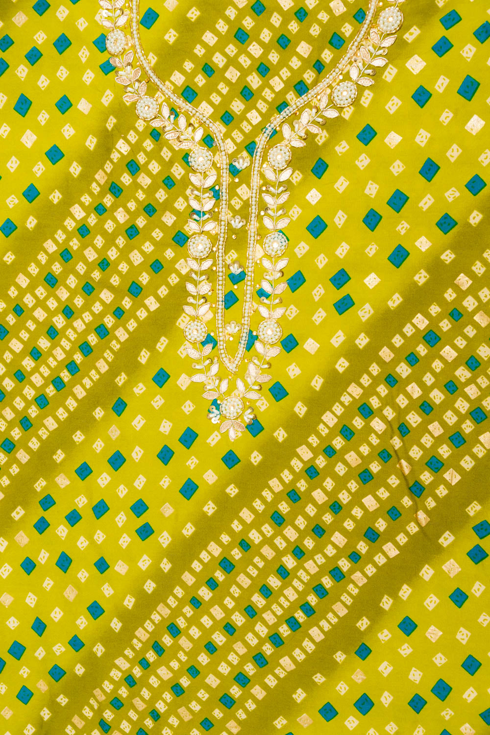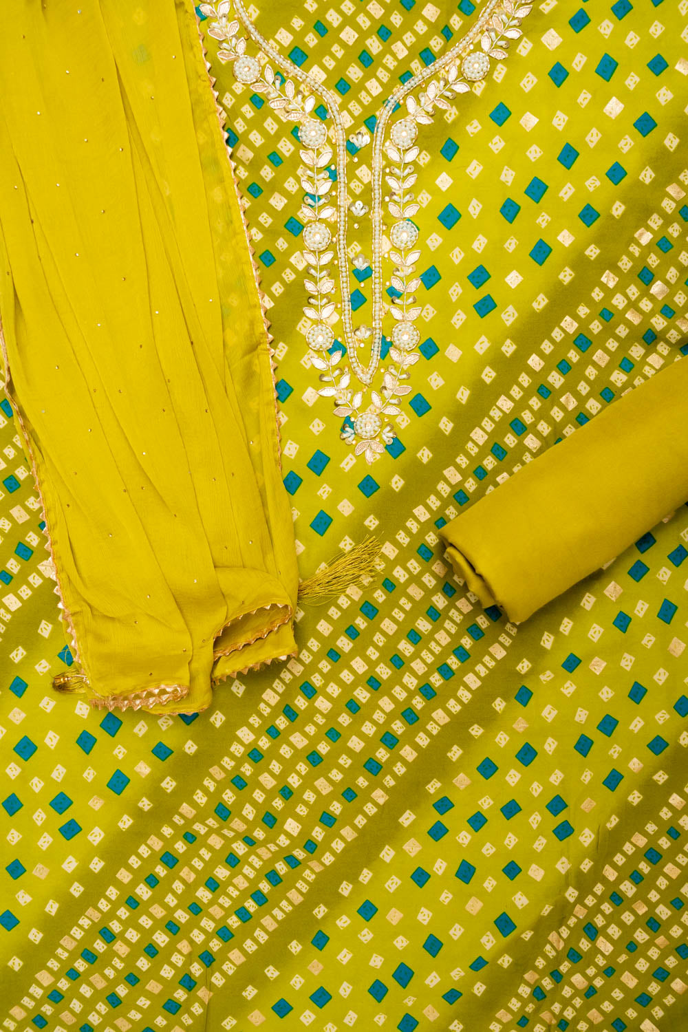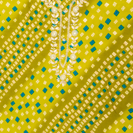 Step into effortless elegance with this stunning Rama unstitched suit set, a perfect blend of traditional artistry and modern grace. The kurta features a Bandhani-inspired print in white and green, beautifully capturing the charm of Rajasthani tie-dye patterns.
