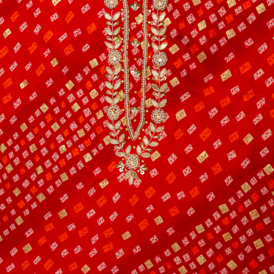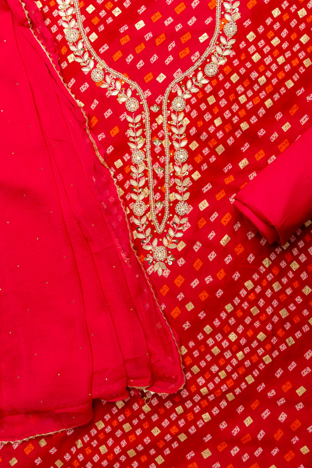 The highlight lies in its intricately Bandhani print reflects timeless Indian artistry. Enhanced with intricate Cutdana detailing, radiant Mirror work, delicate Sequence accents, and sparkling Zarkan embellishments, this ensemble exudes elegance with every detail.