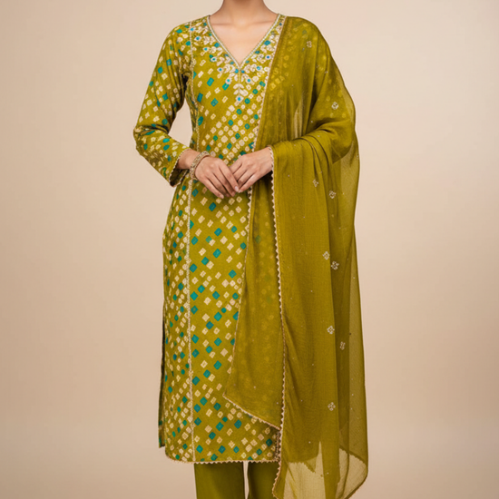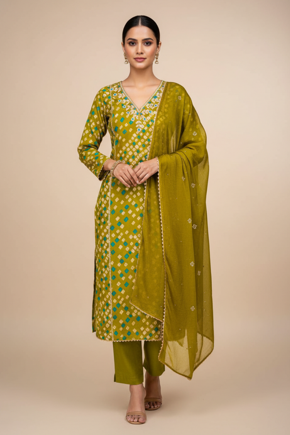 Made from Cotton, this suit with Bandhini Print, Bead, Cutdana, Digital Print, Dabka, Gotta Patti, Swarovski & Threadwork combines elegance with ease for Formal Occasion. Its Color Variations and tailoring options make it a wardrobe staple. Dry Wash / Dry Clean advised.