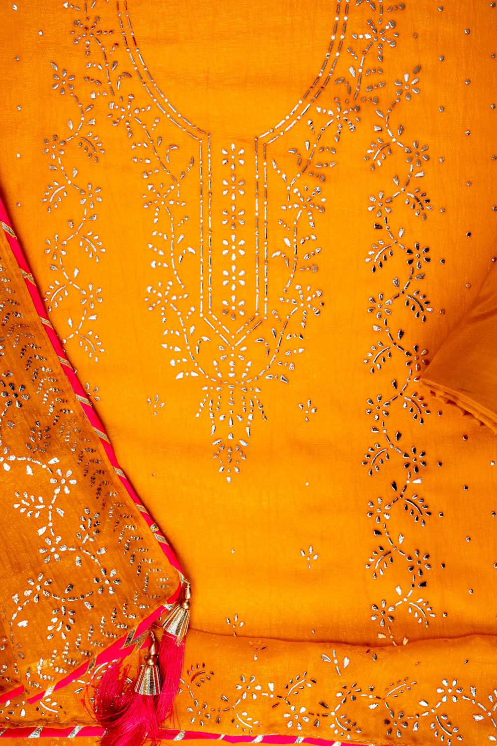 Featuring Mukaish Work, this Shimmer unstitched suit is perfect for Formal Occasion. The Color Variations and tailoring options offer unparalleled versatility. Preserve with Dry Wash / Dry Clean.