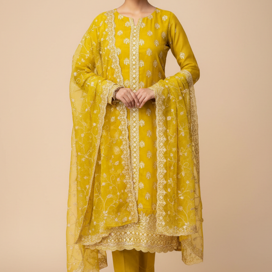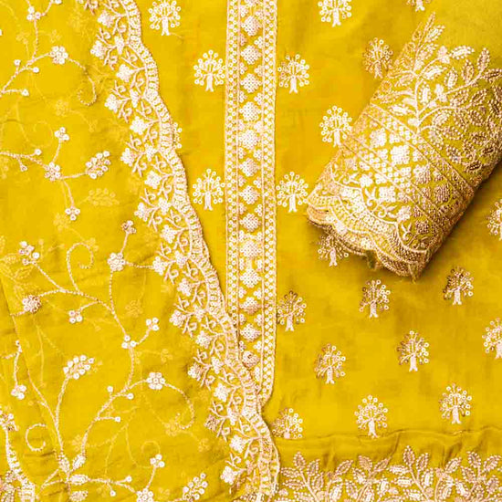 With intricate Sequence & Zari Threadwork on luxurious Organza, this unstitched suit is tailored for Formal Occasion. The Color Variations make it versatile. Keep it flawless with Dry Wash / Dry Clean.