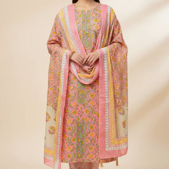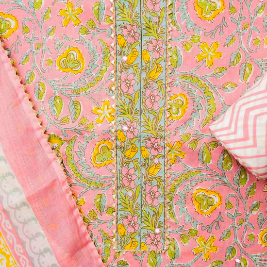Made from Cotton, this suit with Floral Print, Mirror Sheet & Threadwork combines elegance with ease for Informal Occasion. Its Color Variations and tailoring options make it a wardrobe staple. Dry Wash / Dry Clean advised.