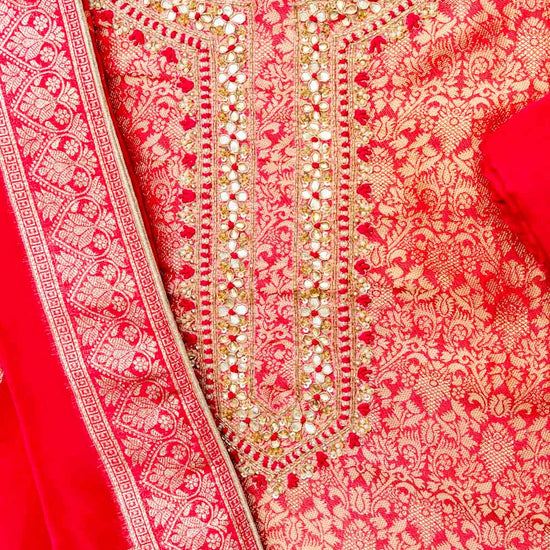 Made from Cotton, this suit with Banarasi Woven Zari, Bead, Cutdana, Dabka, Mirror & Zari Threadwork combines elegance with ease for Formal Occasion. Dry Wash / Dry Clean advised.