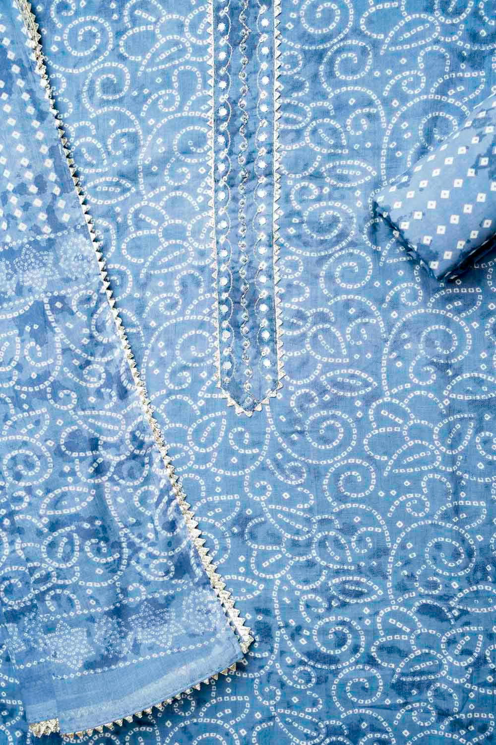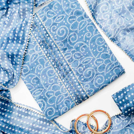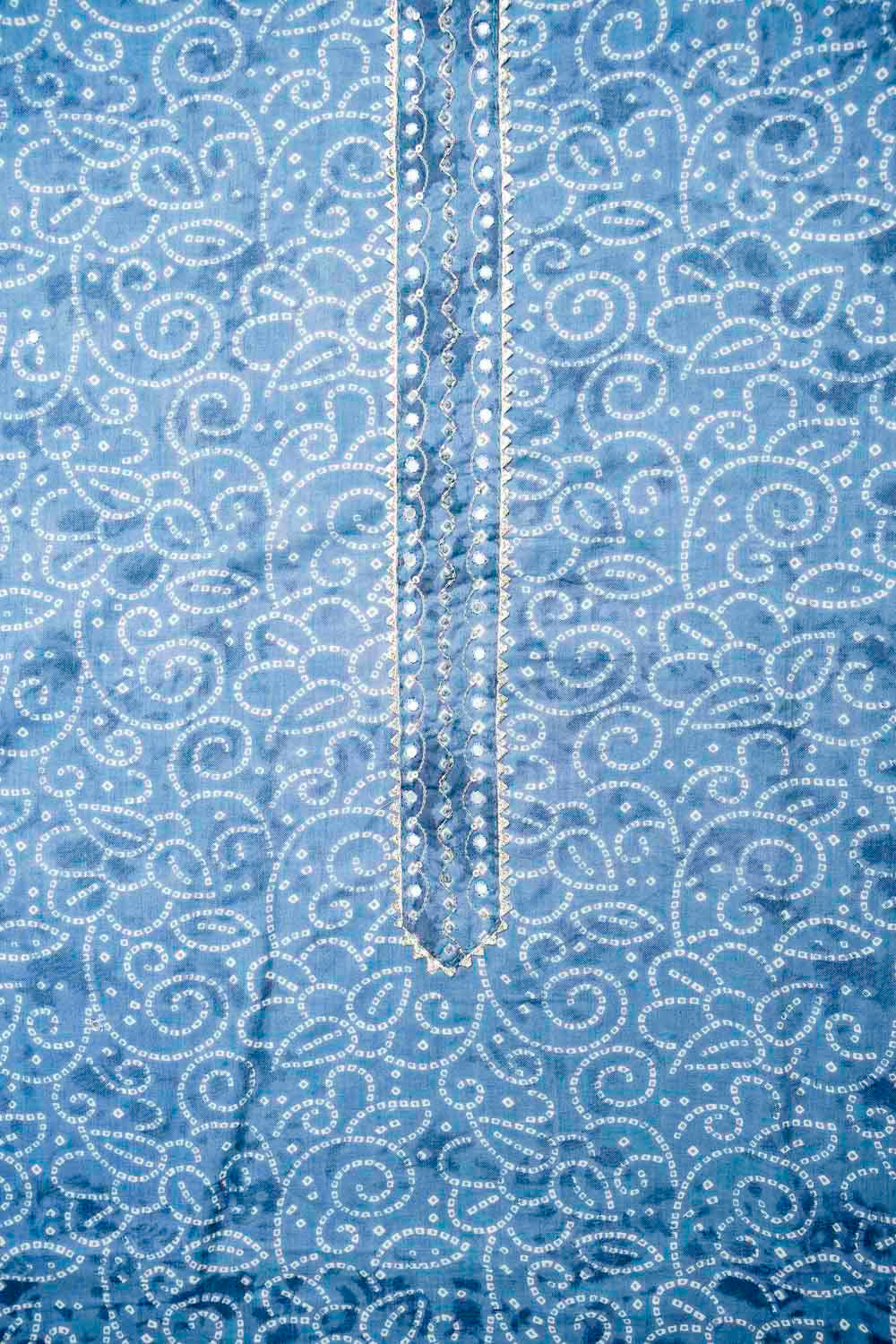 Highlighted by intricate Bandhini Print, Mirror Sheet & Threadwork, this unstitched suit is crafted from Cotton for Formal occasions. Maintain with Dry Wash / Dry Clean.