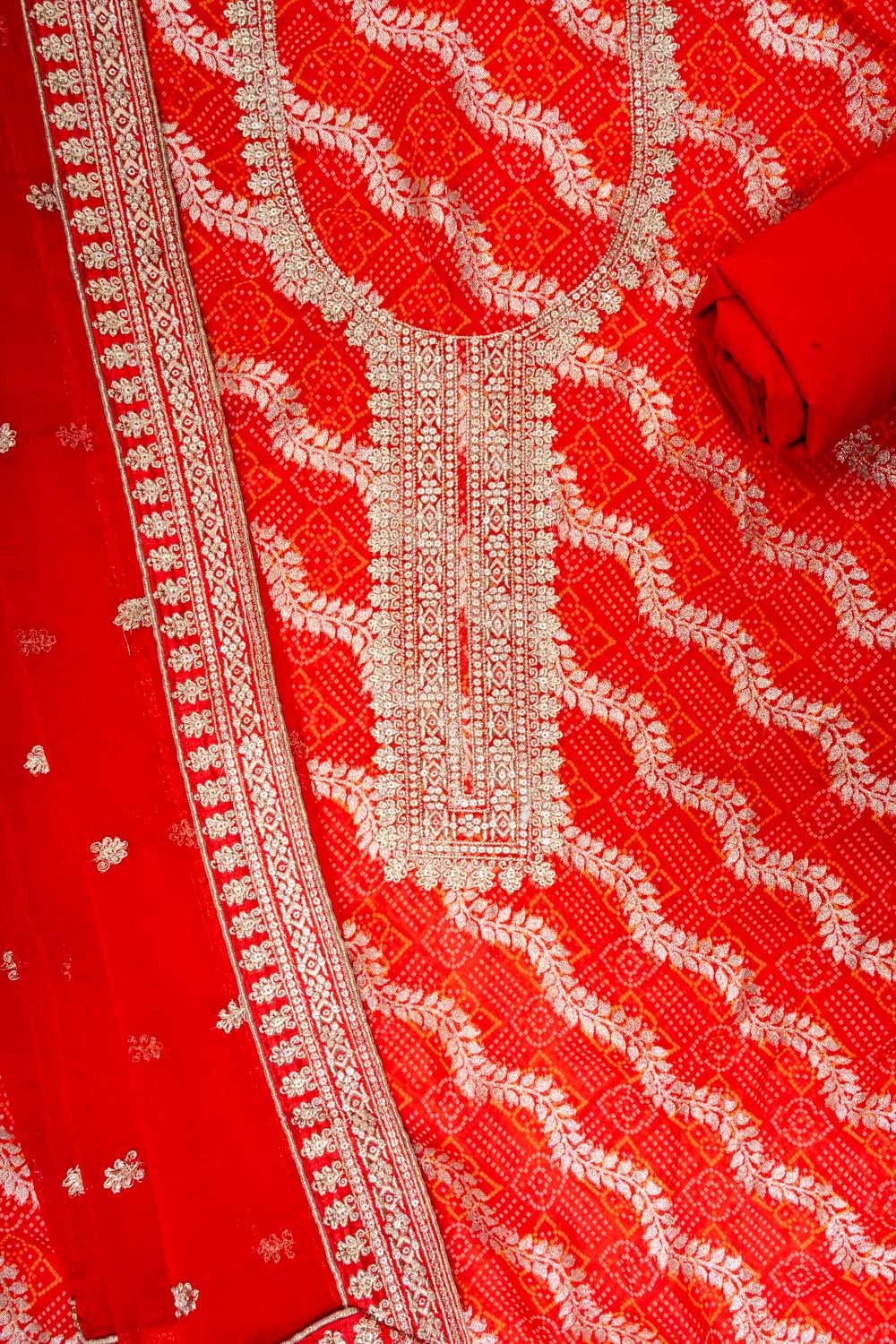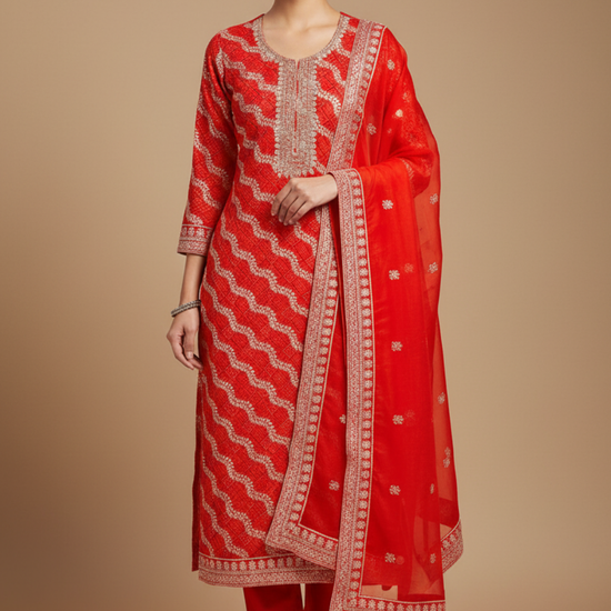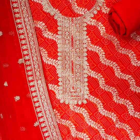 Featuring Banaras Bandhini, Banarasi Woven Zari, Sequence & Zari Threadwork, this Georgette suit is perfect for Formal Occasion. The Color Variations and tailoring options offer unparalleled versatility Preserve with Dry Wash / Dry Clean.
